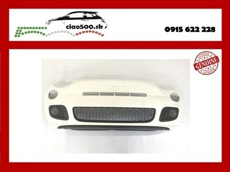 Nový pradný nárazník Fiat 500 v bielej farbe. Nárazník má stredovú mriežku a obe krytky na hmlovky.